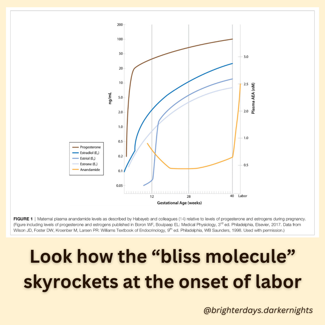 The endocannabinoid anandamide, the “bliss molecule” responsible for the feelings of calm associated with cannabis, is also created by women’s bodies, and like serotonin, is usually released in a circadian pattern. However, in labor (and miscarriage, it turns out), this molecule is released in large amounts.