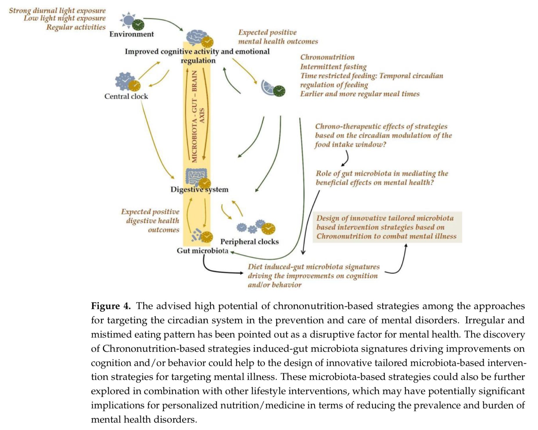 Codoñer-Franch, P., Gombert, M., Martínez-Raga, J., & Cenit, M. C. (2023). Circadian Disruption and Mental Health: The Chronotherapeutic Potential of Microbiome-Based and Dietary Strategies. International journal of molecular sciences, 24(8), 7579. https://doi.org/10.3390/ijms24087579