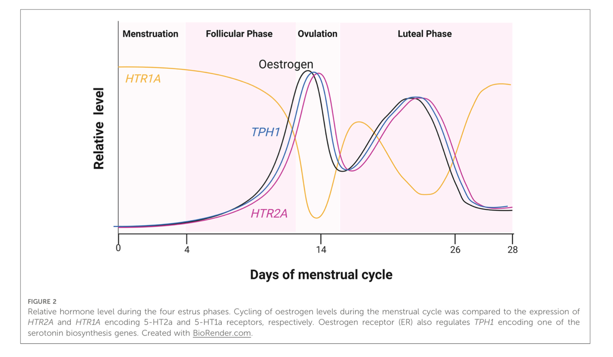 There are energetic differences across the menstrual cycle—you can see them in any chart of female hormones. I particularly like this one because it also shows serotonin expression—pointing to one of our current key challenges of understanding how to address mood disorders and avoid the worse adverse outcomes associated with women on SSRIs compared to men on SSRIs1.
