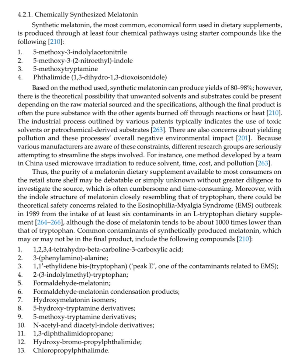 But when melatonin is made in the lab and dosed by humans, it introduces a lot of complication and potential for contamination and errors. In an acute situation, that could be worth the risk, but not in everyday situations (at least to me).