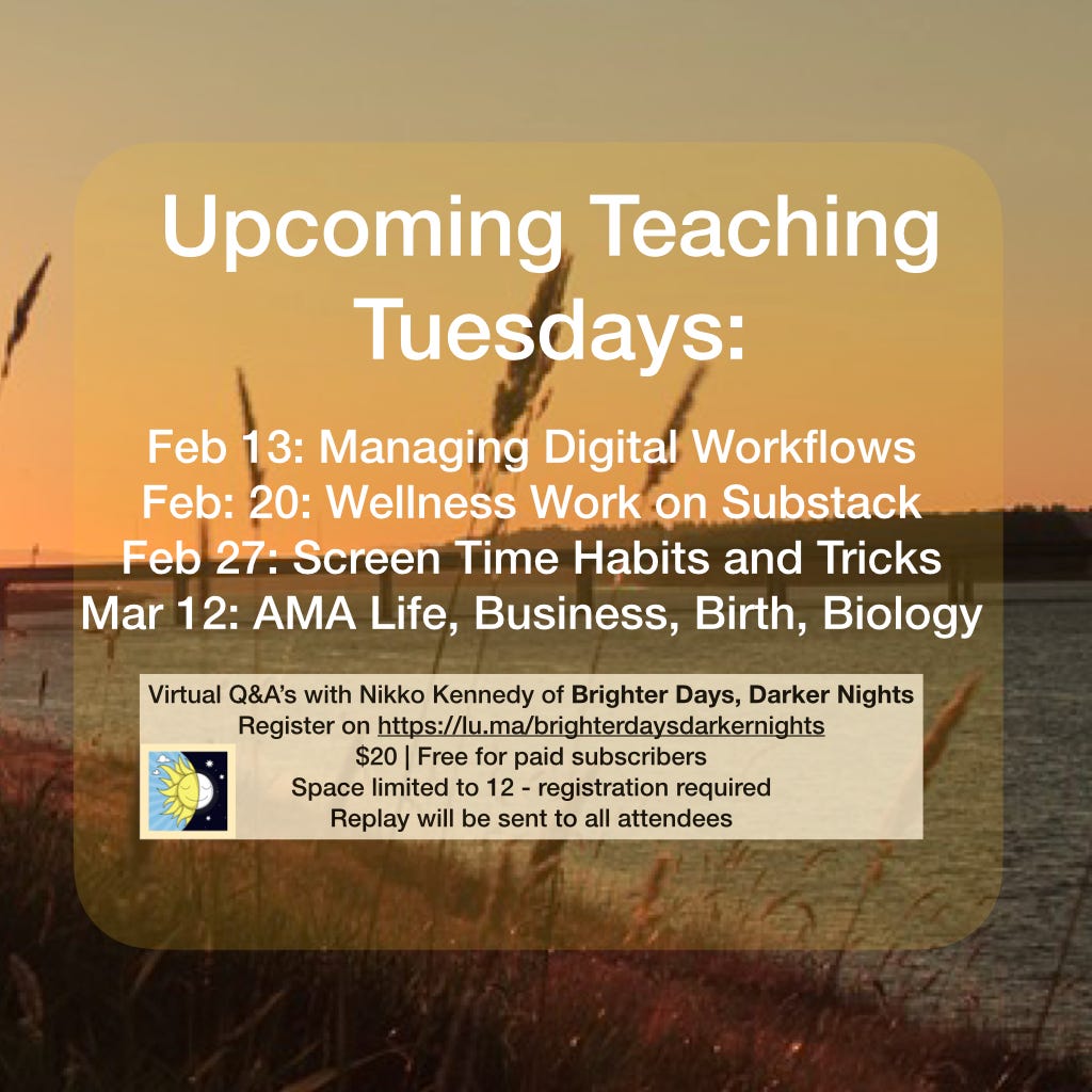 Thank you to all the folks who have been so interested in all this work and so generous in their ideas and requests for topics. I promised my Practitioner group I’d do some business and marketing coaching once per quarter, so here are the dates for these events (all are welcome, but there’s a small ticket price for those who aren’t paid subscribers of Brighter Days, Darker Nights to help me make time for the extra work with sending replays outside of the locked community event page).
